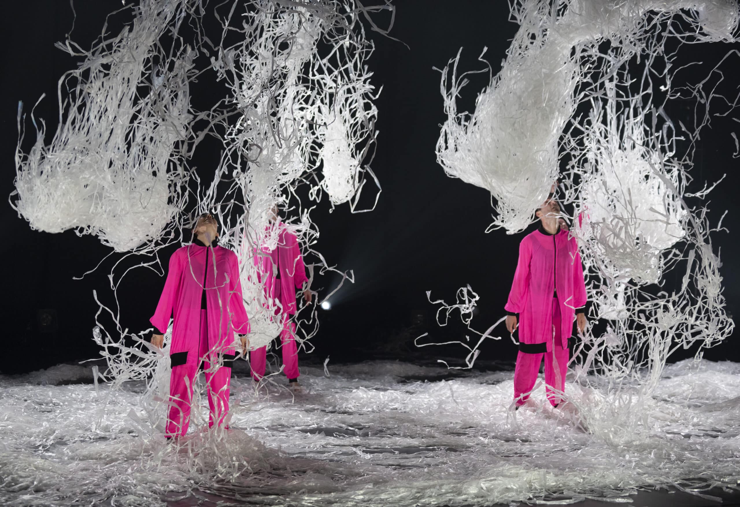 Y es que Loop empieza en el momento en el que termina la representación de Play. Los espectadores verán el escenario desde una perspectiva insólita, desde atrás, como si se encontraran en la parte posterior. Grandes aplausos. Todo ha terminado. O empieza, porque en este espectáculo principio y final se tocan y forman una especie de “loop eterno”. Trabajos de desmontaje, artistas y personal técnico corriendo arriba y abajo hasta dejar el escenario despejado. Solo queda una bailarina bajo un foco… Y es que ella y sus compañeros y compañeras, pero también el personal del teatro, los focos, las bambalinas, el suelo de linóleo, los ventiladores y todo el material que se utiliza habitualmente en una puesta en escena, son el tema de este espectáculo, toda una declaración de amor por los escenarios y por esa magia que convierte un espacio vacío en cualquier cosa que público, artistas y creadores de todo tipo quieran imaginar.